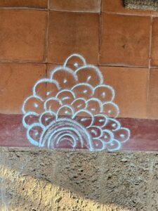 Hmm… My villa, with a skylit inner courtyard, three trees, a shower that is again open to the skies, huge storage areas, an upper area that is meant for yoga practice but can provide a cozy nook for relaxing, snoozing, or just taking in the tropical views. A freshly done kollam magically appears every evening.