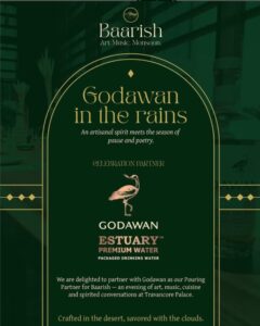 Preempting the onset of the rainy season, the Travancore Palace came alive with the sights, sounds, and scents of the monsoon as Baarish–an immersive art and culture experience curated by Excurators and India Cultural Hub–opened its first edition to a resounding reception. Designed as a multi-sensory tribute to India’s most beloved season, Baarish brought together music, art, performance, and cuisine to evoke the spirit of rain in all its poetic intensity. Under a cool and crystal-clear canopy, an immersive entry experience featuring ambient mist, evocative visuals, and rain-inspired soundscapes, welcomed the guests.