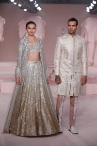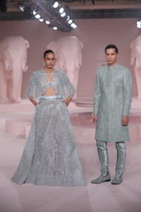 Pastel shades dominated their ‘Renaissance Reverie’ collection. The line reflected their love for art and the treasures they encounter during their travels. Inspired by colours of art of the Renaissance era, and the influences of embroidery textures, the designers paid homage to European architecture, and fashion, while simultaneously honoring the artistic mastery of Indian influences and inspirations.