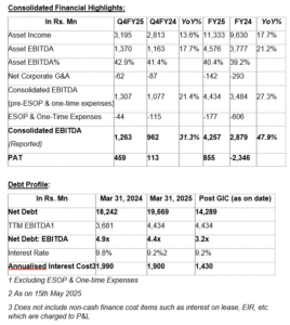 - Asset Income and Asset EBITDA grew YoY by 13.6% and 17.7% respectively. Q4FY25 Asset Income and Asset EBITDA YoY change % on a same store basis is 15.8% and 22.0% respectively. Same store growth & positive impact of ACIC acquisition led to strong growth in income and EBITDA.