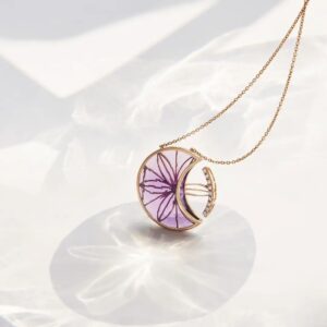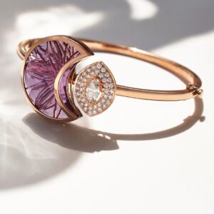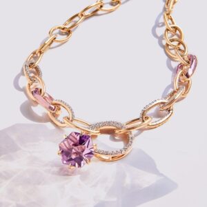 A Link to the Cosmos: A pink amethyst inspired by platonic solids sits atop a diamond studded ring. Clasping the ring from both sides are long elliptical orbits made of stunning rose gold. An ocean of feminine energy and potential finds its wings in the ‘Aeterna’ collection which seeks inspiration from the ‘Flower of Life’.