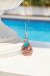 Scarlet Macaw Necklace: As vibrant as the plumes of the scarlet macaw her strength blooms in every hue captivating all those who set their eyes on her brilliance. This elegant pendant features a turquoise stone with rows of sapphires, rubies and diamonds in shifting hues that capture the grace of a Scarlet Macaw’s feathers.