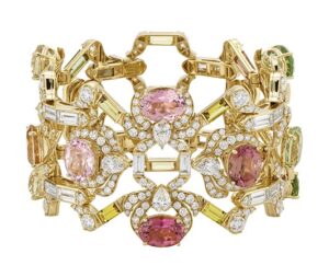 Autumn is about warmer, muted tones is stones such as yellow sapphire, pink tourmaline and mandarin garnet. A splendid 78 carat yellow sapphire necklace is surrounded by a colourful array of tourmalines and diamonds, while a vintage-style yellow gold bracelet is set with five mandarin garnets cut into three different shapes.