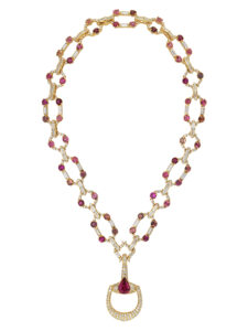 Spring is a magnificent, cushion-cut 226 carat green tourmaline in openwork metal, with star motifs and diamond baguettes, its vividness offset by coloured tourmalines and diamonds on the necklace’s chain. Elsewhere a necklace with a 161-carat cushion-cut pink tourmaline is encircled by multiple levels of diamonds and coloured enamel, set on a chain with 72 tourmalines of 88 carats.