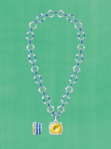 Spring is a magnificent, cushion-cut 226 carat green tourmaline in openwork metal, with star motifs and diamond baguettes, its vividness offset by coloured tourmalines and diamonds on the necklace’s chain. Elsewhere a necklace with a 161-carat cushion-cut pink tourmaline is encircled by multiple levels of diamonds and coloured enamel, set on a chain with 72 tourmalines of 88 carats.