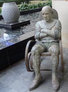 These profound words by Pablo Picasso resonate deep in the plush corridors of the super deluxe Ritz Carlton, Bangalore, which has art at its heart. Striding up the path to the entrance doors of the hotel, the first encounter is with the life size bronze sculpture of a frowning Pablo Picasso in a rocking chair, made by the American artist Robert St Croix. The plaque alongside informs that it was specially commissioned for Nitesh Residency Hotels, the owners and developers of the Ritz Carlton, Bangalore. Deeper to the left behind Picasso’s back, across the water body with low fountains, is the 8 foot bronze ‘Abrazo’, one of an Edition of just six made by the Cuban master sculptor Manuel Carbonell. I am told there are around 1240 art works on display in this hotel. In my eyes, Ritz Carlton, Bangalore has already notched up a few more stars