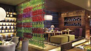 On the rooftop at level 15 is the famous bar Bang, incorporating the open air ambience with outdoor seating that becomes possible in Bangalore’s good weather. DJs, great view, funky cocktails, mezze platters, it is open only in the evenings from 5 to 11.30pm. Ritz Carlton Bangalore is one place with an impressive Champagne list. For a drunken soiree on a reunion with the batch of ’85, order the Pol Roger in a Balthazar bottle of 16 litres. For cuisine from the North-West Frontier Province, visit Riwaz, the interiors of which are by German high-end hotel interior design firm, Peter Silling & Associates.