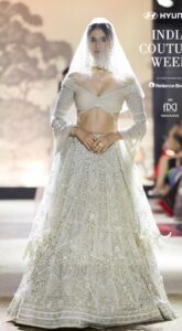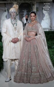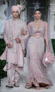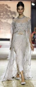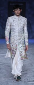 Men’s wear was conventional in colours with ivory in the forefront, but the styles and silhouettes had varying forms. Tarun Tahiliani’s innovative skills in presenting pearls and crystal embellishments in a dramatic manner, is one of his prime sensibilities that turns his ensembles into timeless offerings.