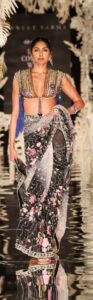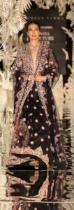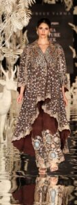 The title was an Urdu word “Sehr” meaning enchantment or early morning magic. Suneet Varma’s bridal wear offering is known around the globe as the ace wedding wear designer has created a name for himself. Suneet’s razzle dazzle has captivated women who long to make a stunning bridal entry. Gentle colours like rose tints, ice lilacs, grey and dramatic black along with gleaming embroidery and mirror work brought the collection of jackets, shararas, saris, draped skirts, corsets, perky shorts, tunics and gowns to life in chiffon and silk.