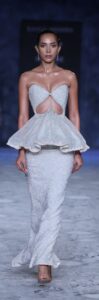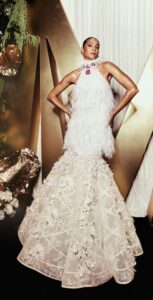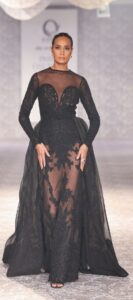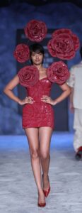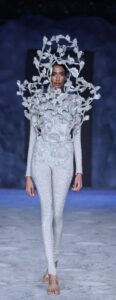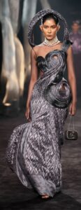 The opening line of glam ensembles in black with glittering embroidery set the pace of the show. The stage décor in all-white featured a menagerie of fauna on land and in the air. Drama and great construction kept the show’s tempo at a heightened level.