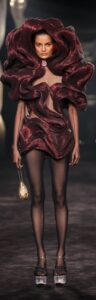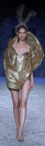 The favourite giant rosettes bobbing around the model distracted from the sleek bodycon mini. The peplum, will-power top with a heart shaped midriff cutout, teamed with a long, pencil skirt, brought the message of the title to centre stage. The sudden appearance of a gold Bob Mackie type, sexy gown didn’t quite fit into the collection, although it was very pretty.