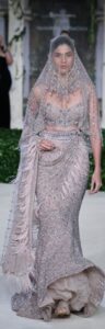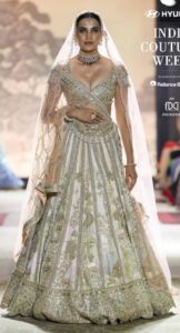 This was the start of fascinators that twinkled on abstract shapes of wires on the head in varying forms. Here the show took on a whimsy angle that moved the attention from the ensembles to the top of the head. Suneet Varma’s shows are supposed to be theatrical presentations. Wish this one had kept the attention on the bridal wear.