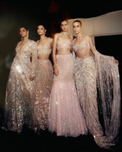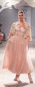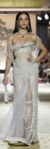 From structured forms to fluid drapes that had softly, sculpted silhouettes, the collection was a feminine symphony of tulle, lace and silk turned into saris, gowns, lehengas, cholis dupattas and even a frothy, flouncy flapper dress with moulded corset. There was a discreet seductive touch for corsets teamed with sheer concept saris, while luxurious sheer sleeves’ trails created magic for the corset/lehenga duos. For the conventional dresser, there were saris and bridal wear, while the Gen Z buyers would love the cropped trousers, bralettes and embellished robes.