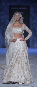 Structured body con fishtail silver gowns with sheer shoulder trails, ornate Lehenga/choli/dupatta that were turned into veils, stylish cropped jackets, draped ponchos, concept sari gowns and the sudden appearance of blue denim jeans with feathered hemlines teamed with a white shirt and lavishly embroidered knee length coat created some stylish bridal wear surprises.