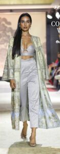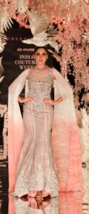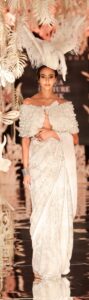 The second part in pastels and white kept the audience gently engaged, till Suneet suddenly broke the serene reverie with two entries. A white sari with a mini cape was accessorized with a giant swan in flight, perched on the model’s head and the other a beautifully embellished gown with flowing, shaded, floor-length, shoulder trails that was accessorized with a giant bird on the model’s head.