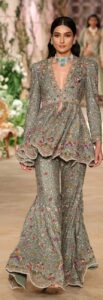 The collection recreated the looks of the past and present, with rich textiles, crafts and silhouettes as the base. The show opened with a Bridge/Diffusion look of separates, jackets, kurtas and tunics and then moved to timeless bridal and occasion wear, featuring the grand lehenga, choli and dupatta trios for the wedding festivities. Florals, paisleys and traditional motifs came alive on silks and velvets. Prints were in earthy tones and embellishments highlighted the beauty of the Indian crafts that were the focal point of the collection. The “Threads of Time: Reimagined” offering will once again serve as timeless, heirloom pieces for the buyers.