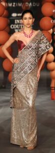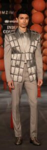 Colours moved from aged gold, deep red, gunmetal to silver and midnight jewel toned shades. The collection was an ode to metal that could not be termed as the conventional traditional bridal attire. It was a tailored, sculpted, draped, formal occasion wear offering for both sexes. Rimzim’s signature metal wires did all the fashion talking for the collection that spoke a very futuristic language.