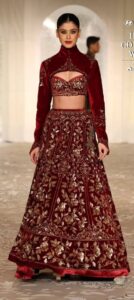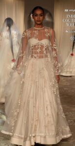 The seductive bralette with strands of crystals was teamed with an ornate fishtail skirt, moulded jackets appeared with shararas, while the sleek gowns, some with heavily embellished corsets and balloon skirts added a new dimension to bridal couture. The traditional lehenga, choli and dupatta trio were emphasized with cascading multicoloured embroidery in jewel tones. The black angular cut, fish tail gown with intense embroidery, turned regal with the sheer, attached, floor kissing cape.