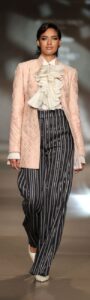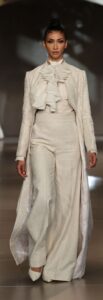 Women’s wear had a marked androgynous touch when cinched waistbands and ruffled construction was evident for the well-tailored sets in a palette of ivory that was highlighted with gold and pearl accent. Long-sleeved cropped jacket with ruffled shirt looked ideal with black, high slit, long skirt, pinstripe trousers and blush pink jacket with the Little Lord Fauntleroy style shirt created a stylish trio, while the all-white wide trousers, shirt and floor length coat was all about drama.
