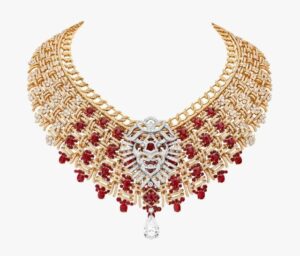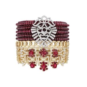 The centerpiece of the collection is the Tweed Royal necklace, which forms parts of the Tweed Lion chapter. Formed using a woven golden chain set with 37 rubies, the plastron necklace features a clever transformable design that allows for a central diamond-encrusted lion head to be removed and worn as a brooch, while a stunning 10.17 carat D Flawless pear-cut white diamond can also be detached and worn as a ring.