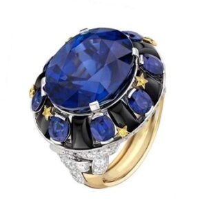 Organized into five chapters around these symbols, across the collection sapphires, diamonds, beryls and other precious stones are combined with white, yellow and rose gold to create intricate designs immediately evocative of their inspiration. The Tweed Solaire ring, for example, nestles fiery orange and yellow topaz and beryls among yellow gold and diamonds for a sunshine-hued piece that immediately recalls the texture of tweed.