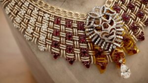 The centerpiece of the collection is the Tweed Royal necklace, which forms parts of the Tweed Lion chapter. Formed using a woven golden chain set with 37 rubies, the plastron necklace features a clever transformable design that allows for a central diamond-encrusted lion head to be removed and worn as a brooch, while a stunning 10.17 carat D Flawless pear-cut white diamond can also be detached and worn as a ring.